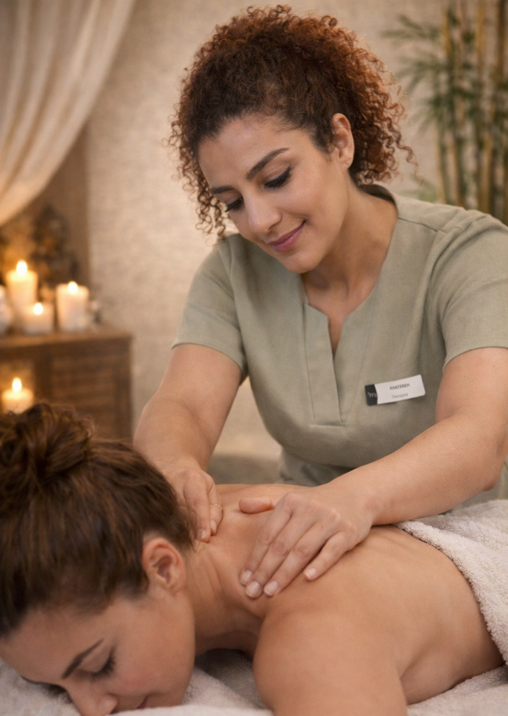 During your session, the therapist uses targeted massage techniques to release tension in key areas of the upper body. The treatment is focused, effective, and deeply relaxing.